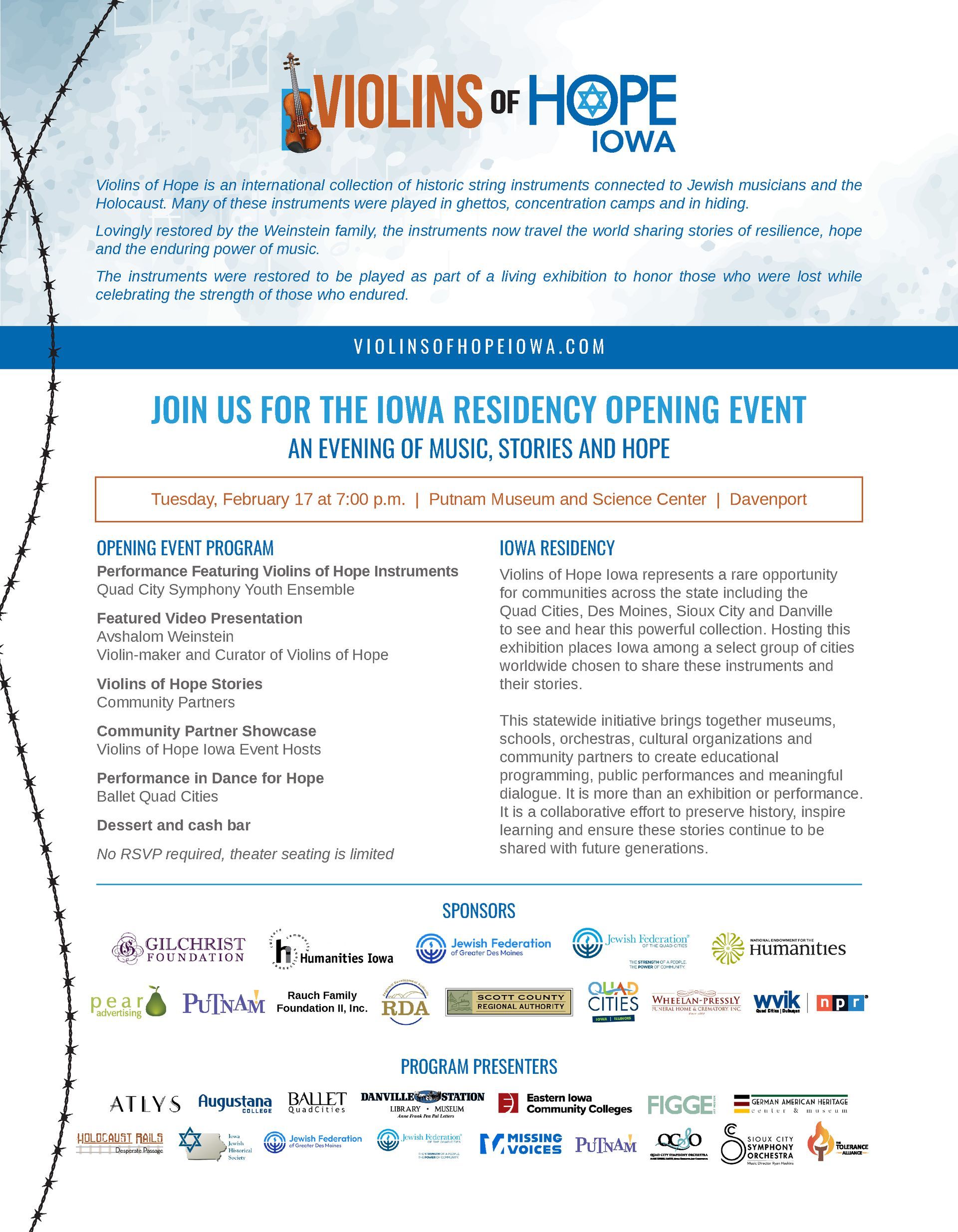 “This is a historic opportunity for Iowa,” said Allan Ross, executive director of the Jewish Federation of the Quad Cities. “Bringing Violins of Hope to multiple communities across the state allows us to reach diverse audiences and create meaningful connections. This residency is about remembrance, education and hope. It is also about ensuring these stories are shared widely and thoughtfully so their lessons endure.”